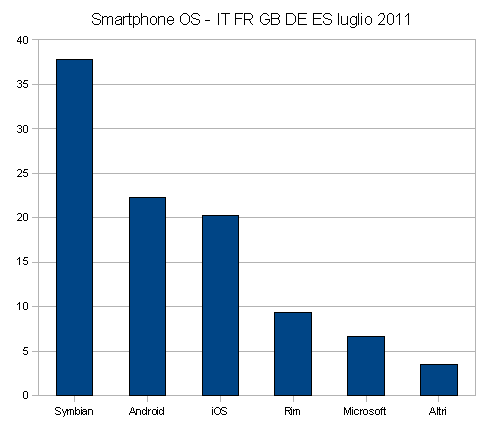 comScore ha diffuso dati aggiornati sul mercato degli smartphone nei principali cinque mercati europei (Germania, Italia, Francia, Gran Bretagna e Spagna). I numeri di comScore si riferiscono al mese di luglio 2011 e vedono ancora Symbian come sistema operativo più diffuso con una quota di mercato del 37,8%. L’ambiente sviluppato da Nokia ha però registrato una perdita di 16 punti percentuali rispetto allo stesso mese del 2010. In seconda posizione sale Android che detiene oggi una quota di mercato del 22,3%, quasi quadruplicata rispetto al 6% del luglio 2010.