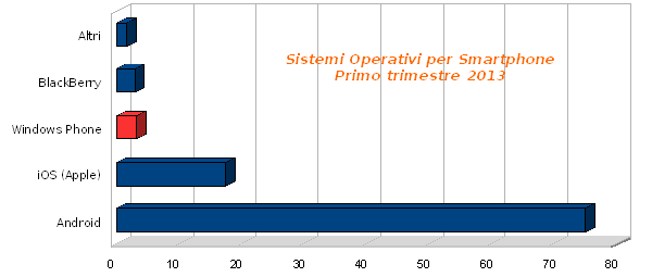 IDC ha diffuso i dati sulla diffusione dei sistemi operativi per smartphone relativi al primo trimestre del 2013. Confermata la leadership di Android e la seconda posizione di iOS, il dato più interessante del trimestre è la crescita a tre cifre di Windows Phone che diventa il terzo sistema operativo per diffusione.