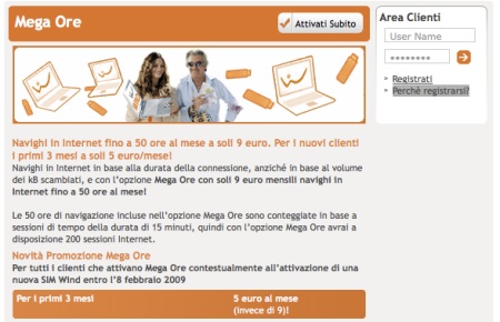 Vi avevamo già presentato la promozione Mega Ore di Wind che consente di navigare in Internet in base alla durata della connessione, anziché in base al volume dei kB scambiati, e con l’opzione Mega Ore con soli 9 Euro mensili si naviga in Internet fino a 50 ore al mese. Le 50 ore di navigazione incluse nell’opzione Mega Ore sono conteggiate in base a sessioni di tempo della durata di 15 minuti, quindi con l’opzione Mega Ore avrai a disposizione 200 sessioni Internet- Per tutti i clienti che attivano Mega Ore contestualmente all’attivazione di una nuova SIM Wind entro l’8 febbraio 2009 per i primi 3 mesi pagano 5 Euro anziché Euro al mese. Tutto benissimo, attenzione però ai dettagli.
