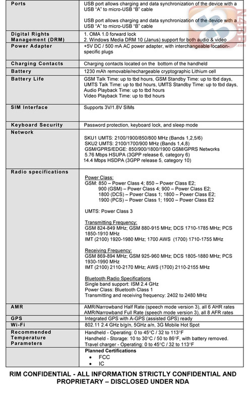 Nessuna sorpresa sul fronte delle caratteristiche tecniche. I nuovi BlackBerry Bold Touch sono equipaggiati con un processore da 1.2GHz, una memoria interna da 8GB, una fotocamera da 5MP, il supporto alla tecnologia NFC e un touch-screen capacitativo da 2.8 pollici. Il loro debutto sul mercato è atteso in tutto il mondo per la prossima estate.