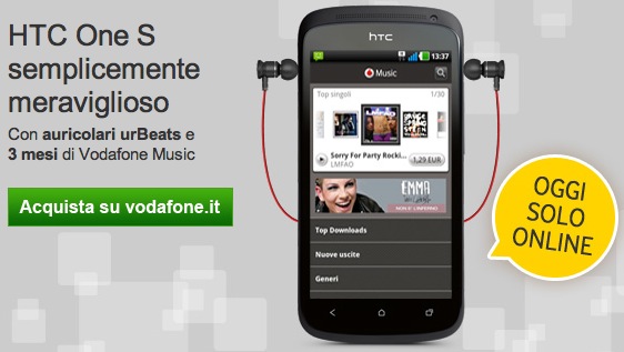 Per la sola giornata di oggi, se acquistate un HTC One S attraverso il sito ufficiale Vodafone ricevete in regalo 3 mesi di musica gratuita da usufruire tramite il servizio Vodafone Music.