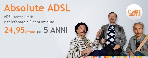 Solo fino al 21 giugno (e solo per i nuovi clienti che si abbonano online) Infostrada offre Absolute ADSL a 19.95 euro al mese per due anni, invece di 32,95, un bel risparmio non c’è che dire. La promozione include navigazione illimitata fino ad un massimo di 8 Mbps e telefonate a 18 centesimi al minuto verso numeri mobili e fissi, 19 centesimi verso i numeri fissi esteri.