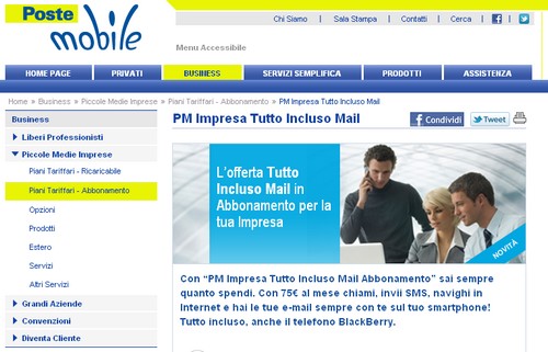L’operatore PosteMobile ha introdotto una nuova tariffa business dedicata alle piccole e medie imprese che necessitino di una offerta “tutto incluso” per traffico voce, SMS ed accesso costante alla posta elettronica. Il nuovo piano tariffario è stato denominato “Impresa Tutto Incluso Mail” e prevede un costo mensile di 75 euro per ciascuna SIM su cui viene attivato. A fronte di questo costo l’offerta prevede anzitutto la fornitura in comodato d’uso di uno smartphone della gamma BlakBerry di RIM.