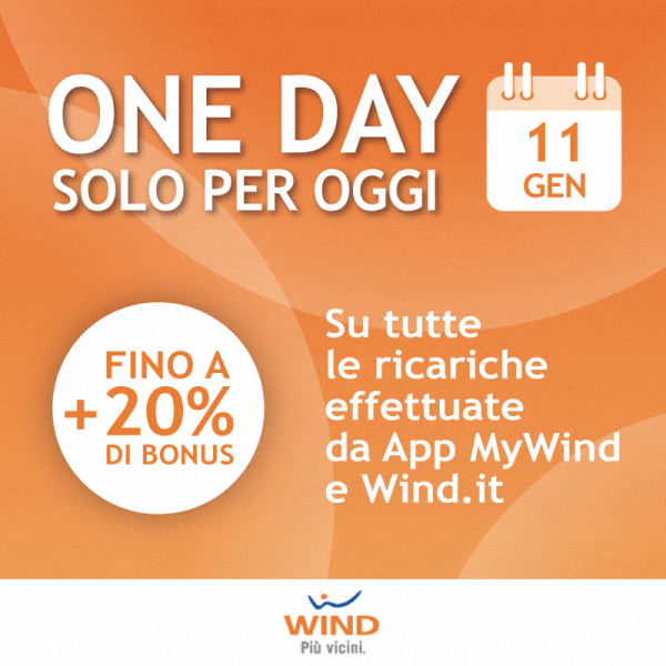 Solo per oggi, venerdì 11 gennaio, Wind offre il 20% di credito bonus su tutte le ricariche effettuate online dal sito, da Facebook o tramite l’app MyWind. I tagli da 15 a 100 euro danno diritto al 20% di traffico extra, ad esempio con una ricarica da 20 euro avremo 2 euro in omaggio, con una da 30 euro 3 euro aggiuntivi e così via.