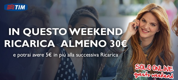 Per tutto il weekend TIM propone una interessante promozione sulle ricariche online. Oggi e domani (10 novembre) infatti effettuando una ricarica dal sito www.tim.it di importo almeno pari a 30 euro si riceverà in premio un bonus di 5 euro ottenibile effettuando una nuova ricarica online entro un mese.