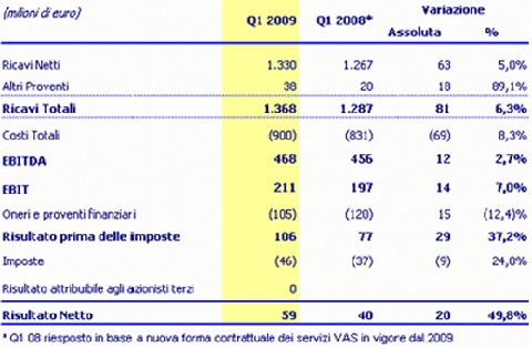 Rispetto allo stesso trimestre dello scorso anno la crescita dei ricavi da servizi è stata conseguita grazie all’aumento della penetrazione dei servizi di banda larga mobile e internet mobile, alla continua acquisizione di clienti in abbonamento, sia privati che business, e al contributo crescente dei servizi di telefonia fissa. Le Sim mobili sono 29.880.000 (-0,5% rispetto a dicembre 2008), con un aumento dei clienti in abbonamento, privati e business, del 19,1%.
