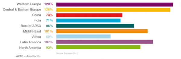 Il nostro pianeta è sempre più invaso dai telefoni cellulari. Dall’ultimo aggiornamento del Traffic and Market Data Report di Ericsson scopriamo che le linee mobili attive hanno superato quota sei miliardi e il numero di abbonati ha raggiunto i 4,1 miliardi. Questo risultato ci dice che oltre il 60% della popolazione mondiale dispone oggi di almeno un utenza cellulare, il 75% delle linee attive è su rete GSM mentre solo il 15% è rappresentato da utenti WCDMA e HSPA.