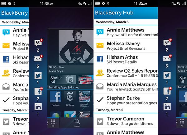 La schermata di destra invece mostra le ultime notifiche ricevute. Come potete vedere sono disponibili email, SMS, notifiche Facebook, BlackBerry Messenger, chiamate e molto altro ancora. Tutto questo in una schermata di riepilogo facilmente accessibile.
