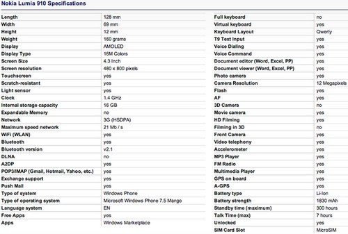 Quanto alla connettività pare confermata l’assenza del supporto LTE, mentre per quanto riguarda l’autonomia del device la tabella pubblicata da typhone suggerisce che il Nokia Lumia 900 sarà in grado di andare avanti per 300 ore in stand-by e per 7 ore in conversazione. La batteria è da 1830 mAh, il sistema operativo Windows Phone 7.5 Mango.