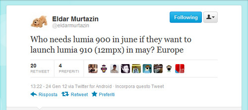 In questi giorni sul Web sono circolate indiscrezioni secondo le quali il Nokia Lumia 900 sarebbe potuto essere commercializzato anche in diversi Paesi europei. Tali voci, sono però state prontamente smentite da Eldar Murtazin, il blogger russo ritenuto una vera autorità per quel che riguarda il settore mobile, che però ha annunciato su Twitter un nuovo smartphone Lumia in arrivo per il vecchio continente: il Nokia Lumia 910.