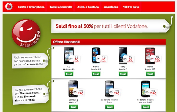 È tempo di saldi anche per Vodafone Italia, che ha associato interessanti promozioni a tutti gli smartphone presenti nel suo listino. Si parte dalla possibilità di acquistare device come Nokia Lumia 820 ed LG Optimus L3 con rate da 1 euro al mese anziché 3 euro (solo ricaricabile), passando per la interessante offerta su Samsung Galaxy Y, Huawei