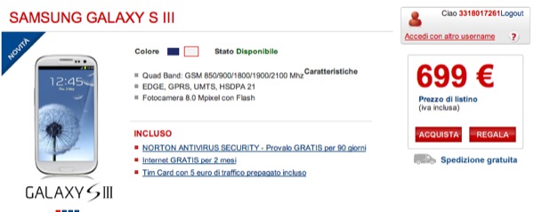 Anche TIM mette in vendita tramite il proprio sito internet il nuovo Galaxy S III, appena approdato in Italia. L’operatore mobile italiano per eccellenza lo mette in vendita al solito prezzo di 699€. Ovviamente stiamo parlando del modello da 16GB, che sarà disponibile da subito sia nel colore bianco che blu.