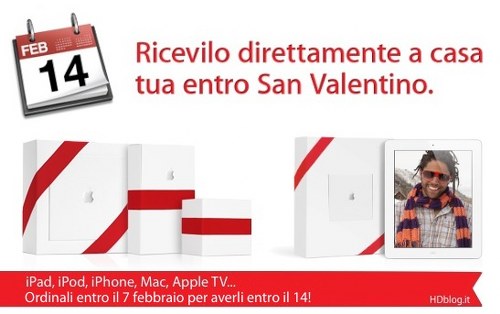Siete ancora indecisi sul regalo da fare al vostro partner per San Valentino? Perchè non approfittare della promozione che Apple mette a disposizione di tutti gli utenti. Una serie di prodotti, tra cui iPad, iPhone, Mac ed Apple TV potranno essere vostri se li ordinate via Internet e vi arriveranno giusto in tempo per San Valentino. L’unico prodotto che non è più disponibile è l’iPhone 4S (il cui termine ultimo per effettuare l’ordine era il 1 febbraio). Avete tempo fino a martedì 7 febbraio per scegliere il prodotto che può rispondere alle vostre esigenze.