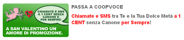 San Valentino è ormai alle porte ed anche CoopVoce propone una nuova promozione a tema che permette a due numeri dell’operatore di chiamarsi reciprocamente ad 1 centesimo al minuto e senza scatto alla risposta e di inviarsi SMS ad 1 centesimo per sempre.