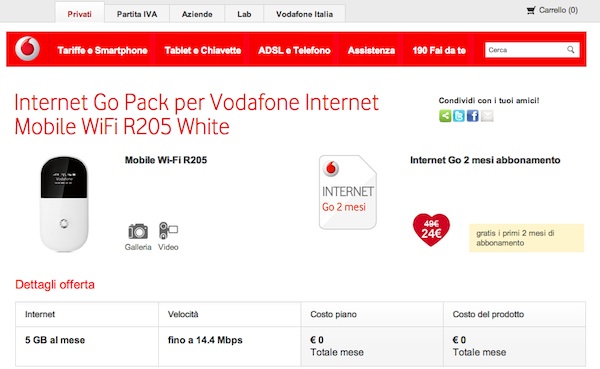 In occasione di San Valentino, Vodafone ha messo in promozione l’hotspot Mobile WiFi R205 incluso nel pacchetto Internet Go Pack che viene venduto a 24 euro anziché 49 con 2 mesi di navigazione Internet inclusa a 14.4 Mbps.