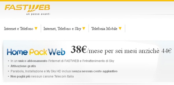 HomePack Web è un pacchetto di servizi proposto da Fastweb che include il collegamento ADSL e l’abbonamento ai canali televisivi di Sky a condizioni vantaggiose. Fino al prossimo 27 agosto è possibile sottoscrivere il pacchetto con uno sconto valido per 6 mesi e usufruendo dell’attivazione gratuita.