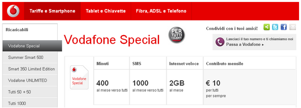 Si chiama Vodafone Special la nuova promozione “tutto incluso” lanciata da Vodafone ed attivabile da poche ore. L’operatore propone un pacchetto completo per chiamate, messaggi, comunicazioni con il proprio numero Vodafone preferito ed accesso ad Internet al prezzo di 10 euro al mese valido per tutti i clienti.
