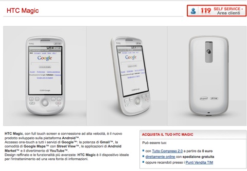 Dopo Vodafone, il nuovo HTC Magic è ora ufficialmente in vendita anche da TIM. Quello che viene considerato il “primo operatore di telefonia mobile italiana” ha inaugurato una nuova sezione del proprio sito Web proprio dedicata all’HTC Magic. Scopriamo così che possiamo portarci a casa un TIM HTC Magic con Tutto Compreso 2.0 a partire da 0 euro, direttamente online con spedizione gratuita (attualmente è ancora disponibile solo in nero) oppure recandoci presso i Punti Vendita TIM.