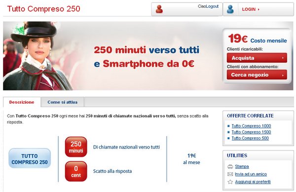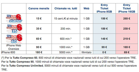 “Tutto Compreso 35”, invece, è la tariffa che sostituisce la vecchia “iPhone Tutto Compreso 250”, e il prezzo passa da 50 euro a 35 euro (i minuti a disposizione sono 200 e il prezzo dei due touchscreen devices sono 189 e 259 euro). “Tutto Compreso 60”, al costo di 60 euro mensili, mette a disposizione 600 minuti di telefonate e le due versioni dell’iPhone a 149 euro e 219 euro. 1000 minuti, invece, per coloro che opteranno per “Tutto Compreso 90”, con un entry ticket di 99 e 169 euro.