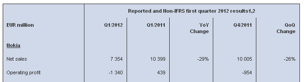 Nokia ha diffuso un primo “Interim Report” sui dati finanziari relativi al primo trimestre del 2012. Per la società finlandese si conferma il periodo di difficoltà con numeri negativi se raffrontati con i valori dell’anno precedente e più in generale con l’andamento del mercato. Nel trimestre Nokia ha registrato vendite complessive per 7,354 miliardi euro in calo del 29% rispetto ai 10,399 miliardi registrati nello stesso periodo del 2011. Forte la contrazione anche rispetto al quarto trimestre 2011 quando di erano registrate vendite complessive per 10,005 miliardi; quest’ultimo dato tuttavia è fortemente influenzato dalle vendite di fine anno.
