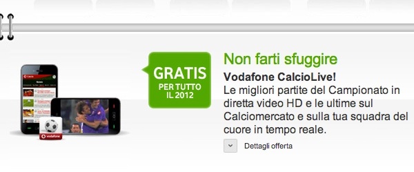 Offerta lampo per tutti i tifosi. Fino alle 18:00 di oggi (22 agosto 2012) è possibile ottenere Vodafone CalcioLive gratis per un anno e vedere le migliori partite del Campionato e delle Coppe Europee in qualità HD su computer, smartphone e tablet. L’offerta è valida anche per chi ha CalcioLive già attivo nel proprio abbonamento.