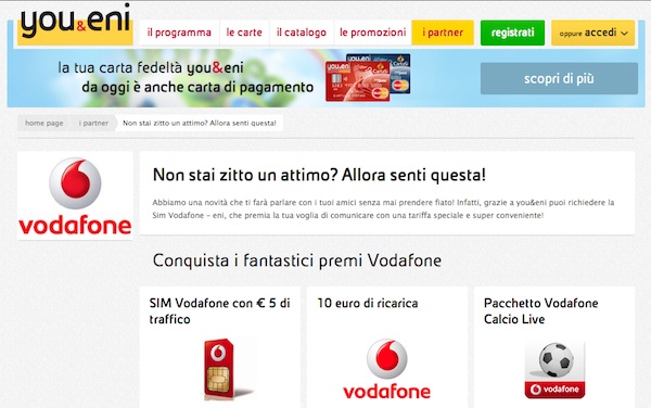 Il mese di marzo sta per volgere al termine e per i clienti di Vodafone You questi sono gli ultimi giorni utili per usare i premi messi in palio dall’operatore in collaborazione con Eni. Effettuando una ricarica da almeno 10 euro entro il 31 marzo, è infatti possibile ottenere un buono carburante di 5 euro da utilizzare presso le Eni Station che aderiscono all’iniziativa.