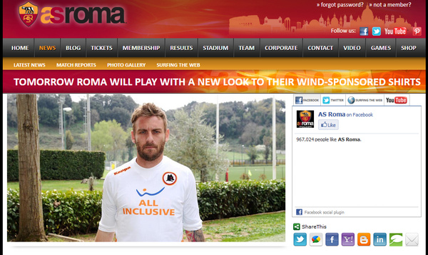 La partnership tra Wind e la A.S. Roma si rafforza sempre di più. Sabato scorso, durante lo sfortunato match contro il Milan finito 2-1 per la compagine lombarda, il team giallorosso è sceso in campo con il brand Wind All Inclusive sulla maglia.