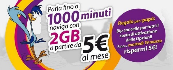 SPECIALE FESTA DEL PAPA’! Fino al 19 marzo Bip Mobile ti regala il costo d’attivazione di tutte le Opzioni! Risparmia subito 5€! Scegli tra Bip 1000, Bip 500, Megabip Day, Bip Day (disponibili anche nelle versioni “large”) e Megabip Smartphone: per te a partire da 1€ a settimana!