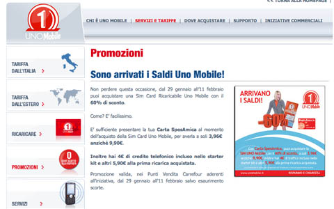Dal 29 gennaio all’11 febbraio è possibile acquistare una Sim Card Ricaricabile Uno Mobile con il 60% di sconto: è sufficiente presentare la propria Carta SpesAmica al momento dell’acquisto della Sim Card Uno Mobile, per averla a soli 3,96 Euro anziché 9,90 Euro. Si ottengono inoltre ben 4 Euro di credito telefonico incluso nello starter kit e altri 5,90 Euro alla prima ricarica acquistata.